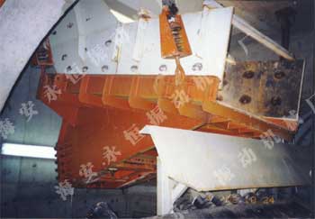 香蕉篩主要由篩箱、篩網、激振器、減振彈簧和下座架等組成。香蕉篩是由電動機和激振器作為振動源,激振器主要是由偏心軸、皮帶輪、軸承及軸承座等組成,激振器安裝在篩箱側板上,并由電動機通過三角皮帶或軟連接與其相連,